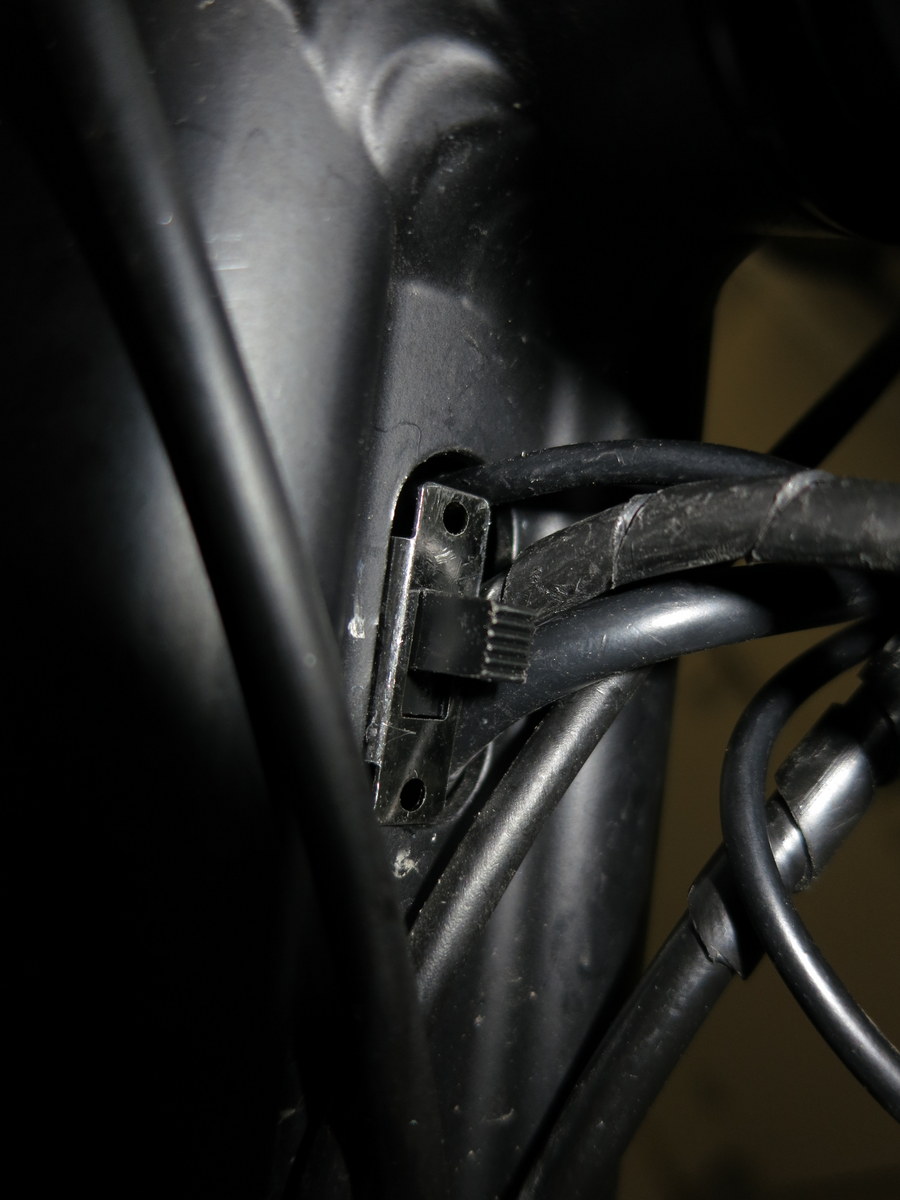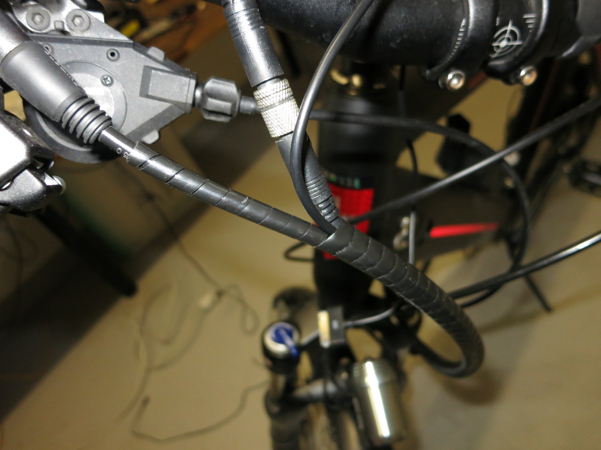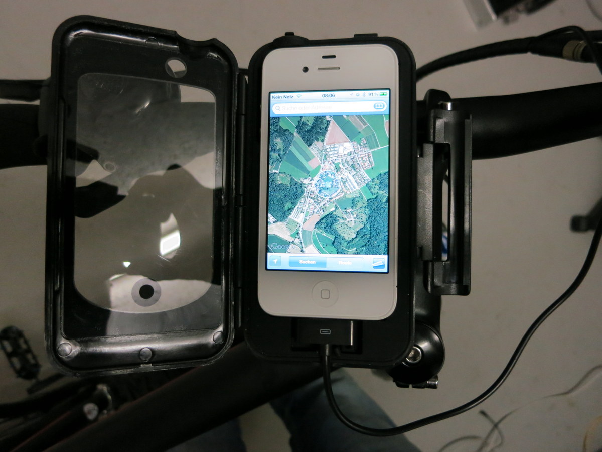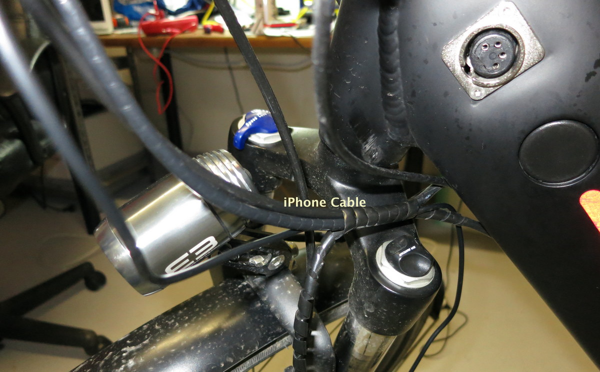 Das USB Ladekabel für das iPhone habe ich in der Spirale zusammen mit Hinter bremse Kabel und Interface Kabel versteckt.