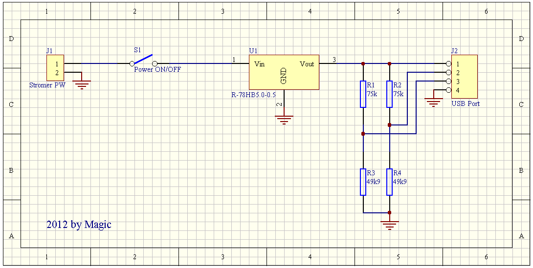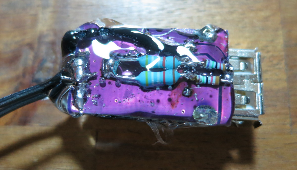 Die Widerstände R1/R3 und R2/R4 sind nichts anderes als ein Spannungsteiler. Die sind nötig nur für das iPhone ung sagen dem Natel wie viel Strom kann er maximal aus dem Ladegerät ziehen. Hier werden die USB Pins D- und D+ auf genau 2 Volt gesetzt = Ladegerät mit max. 500mA. Wer ein anderes Handy einsetzen möchte braucht diese Widerstände nicht einzubauen.